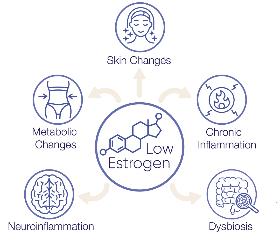 When estrogen and progesterone levels fluctuate during perimenopause, and eventually decline in menopause, the protective effects of these hormones are lost. This results in significant changes in the composition of the gut microbiome, activation of inflammatory pathways and metabolic disruptions within all organs.